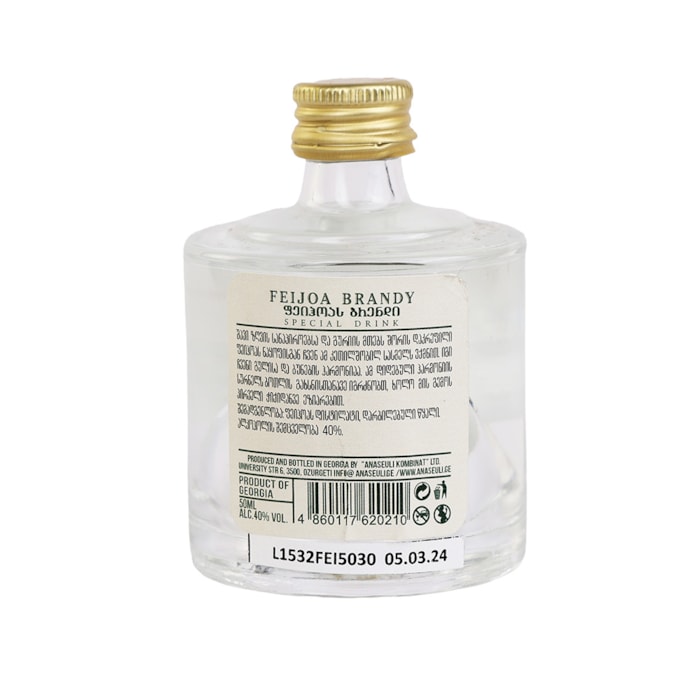 Vodka Anaseuli Feijoa 40% - 0.05L Brand Anaseuli Origin Georgia Aroma Intense, Exotic feijoa Taste Refreshing, Mild, Velvety Technology Double fruit distillation Alc. percentage 40% Volume 0.05 L 10.9₾ In stock Add
