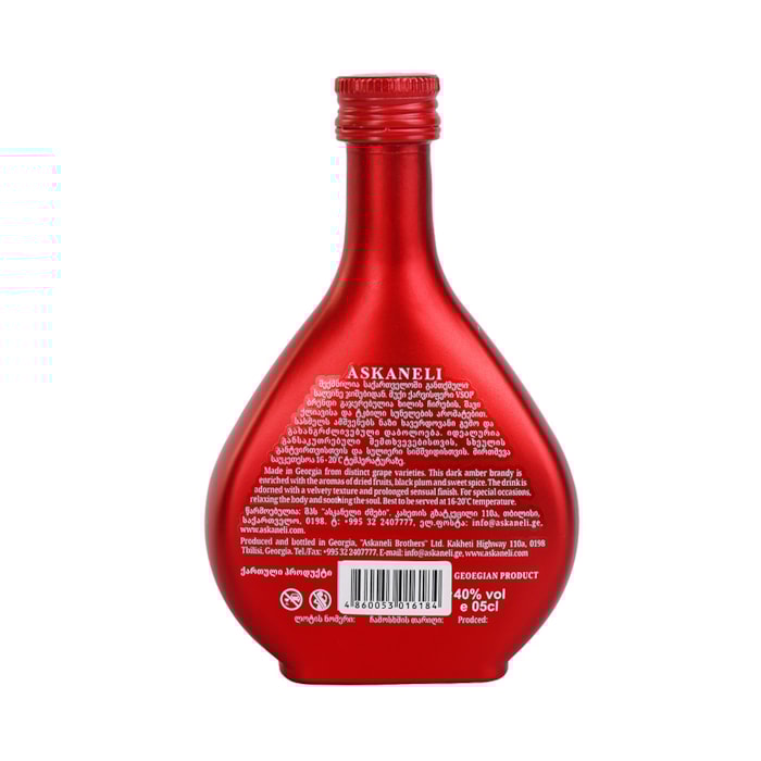 Brandy Askaneli V.S.O.P. 40% - 0.05L Brand ასკანელი Origin Georgia Aroma Rich vanilla, spicy oak Taste Chocolate, dried fruit, velvet Technology 7-year oak barrel aging Alc. percentage 40.00% Volume 0.05 L 13.5₾ In stock Add