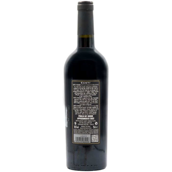 Wine Vino Rosso IGT Puglia Pasito Gran Passero Canti 14% - 0.75L Brand Canti Origin Italy Aroma Dried fruit, plum, vanilla Taste Full-bodied, intense, sweet Technology Dried grape method (Appassimento) Alc. percentage 14.00% Volume 0.75 L 30.9₾ In stock Add