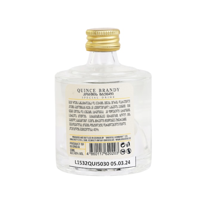 არაყი Anaseuli კომშის 40% - 0.05ლ ბრენდი Anaseuli წარმოშობა საქართველო არომატი მდიდარი, კომშის არომატი გემო აბრეშუმისებრი, რბილი, ხილის ტექნოლოგია ორმაგი ხილის გამოხდა ალკ. შემცველობა 40% მოცულობა 0.05 L 10.9₾ მარაგშია დამატება